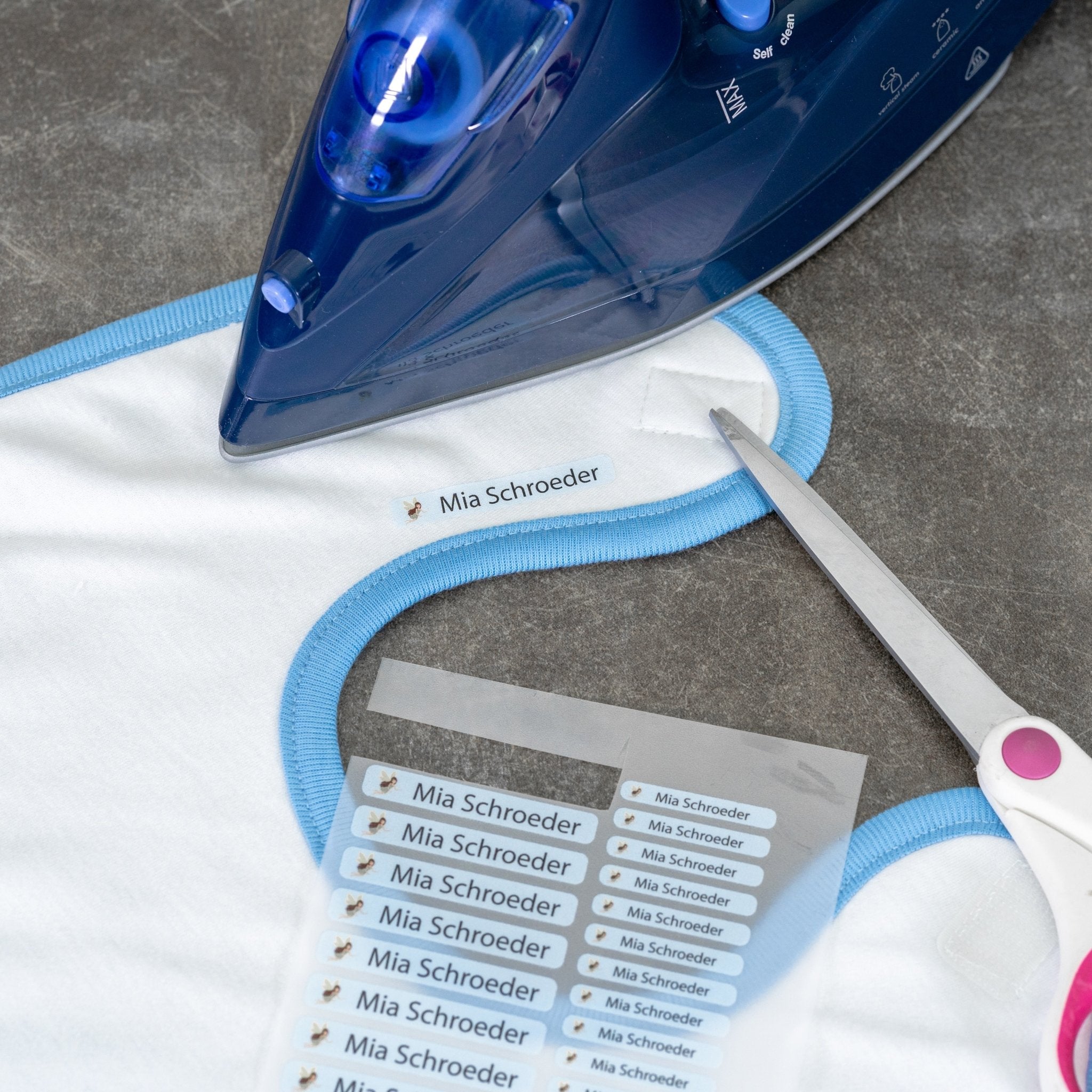 Iron-on labels for children's clothing are the uncomplicated solution to bring order to your child's wardrobe. Thanks to the thermoadhesive nature of the labels, application is child's play. All you need is a dry iron.