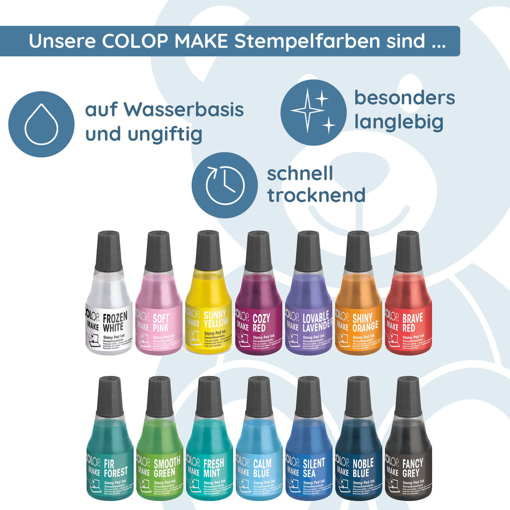Discover the optimal solution for extending the life of your Colop MAKE stamp pads with our matching refill bottles. This special refill ink ensures that your stamp pads are always evenly and richly supplied with color, so every stamp impression remains clear and precise.