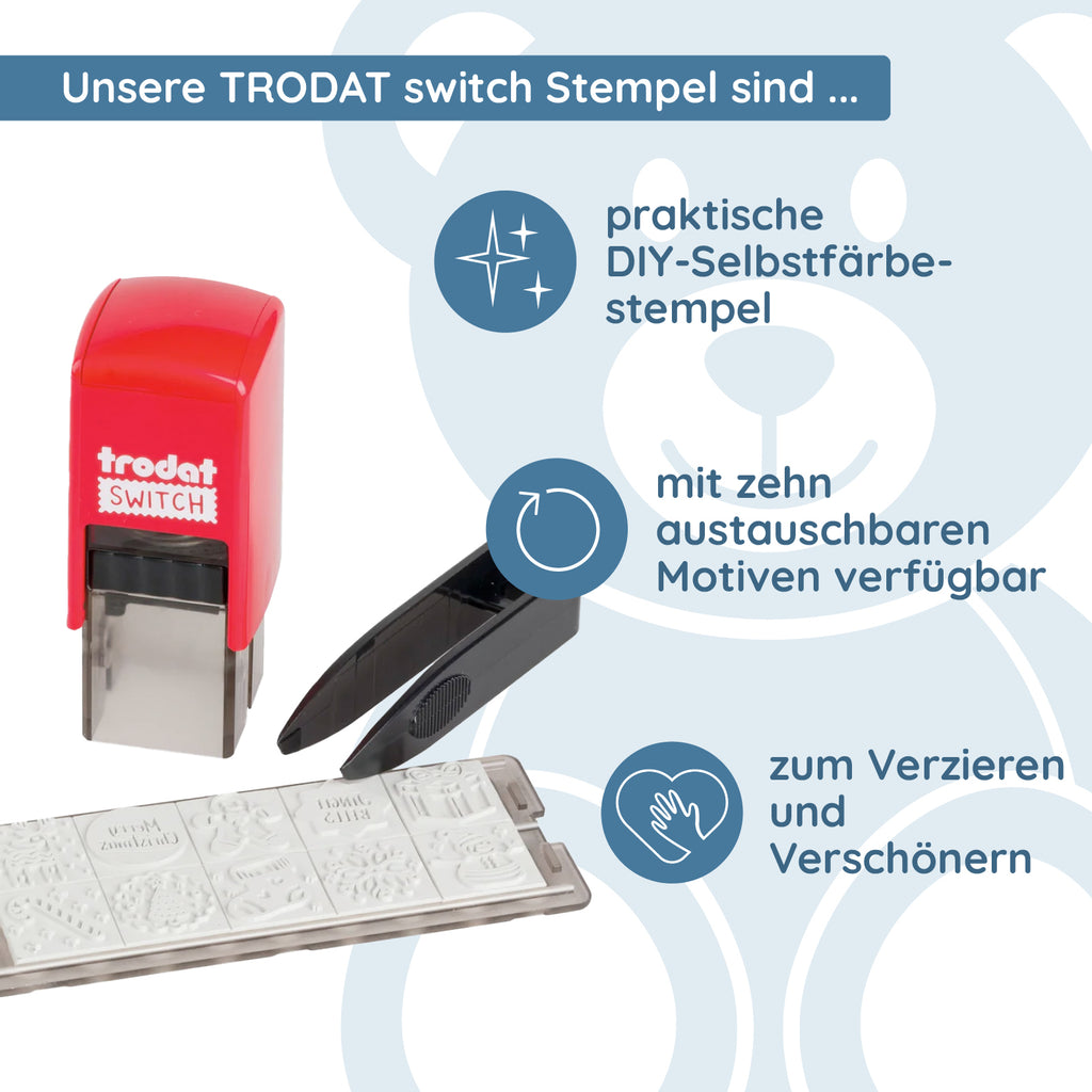 With the Trodat Switch Christmas stamp set, you bring festive cheer to cards, gift tags, packaging and decorations! Whether heartfelt Christmas greetings, wintry motifs or playful symbols – with 10 interchangeable stamp designs you can create your holiday creations individually.