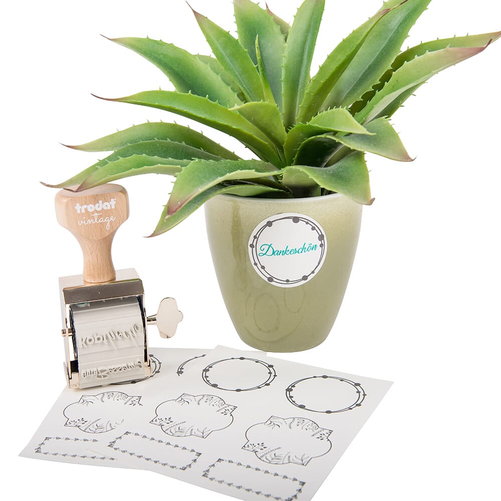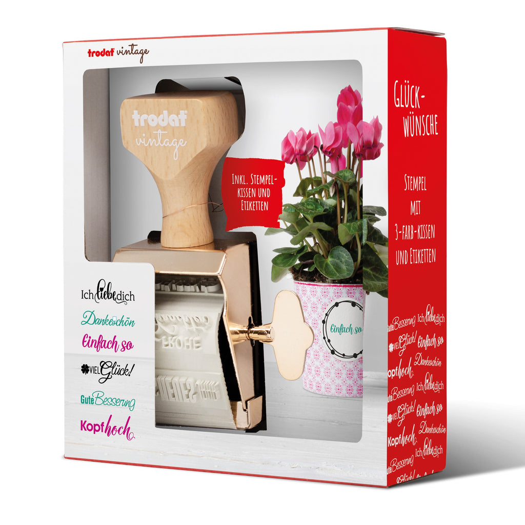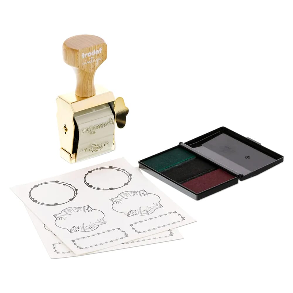 Timbre vintage Trodat avec 6 motifs spéciaux sur le thème 1 tampon encreur manuel avec 3 couleurs (noir, vert et pourpre) et 12 étiquettes selon l'occasion.