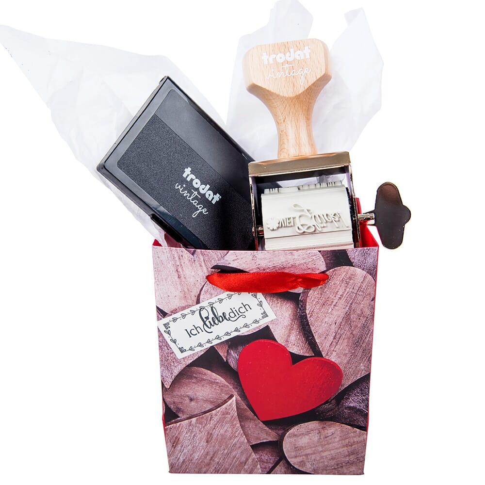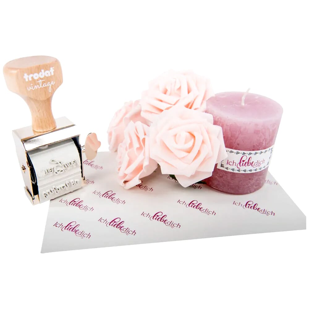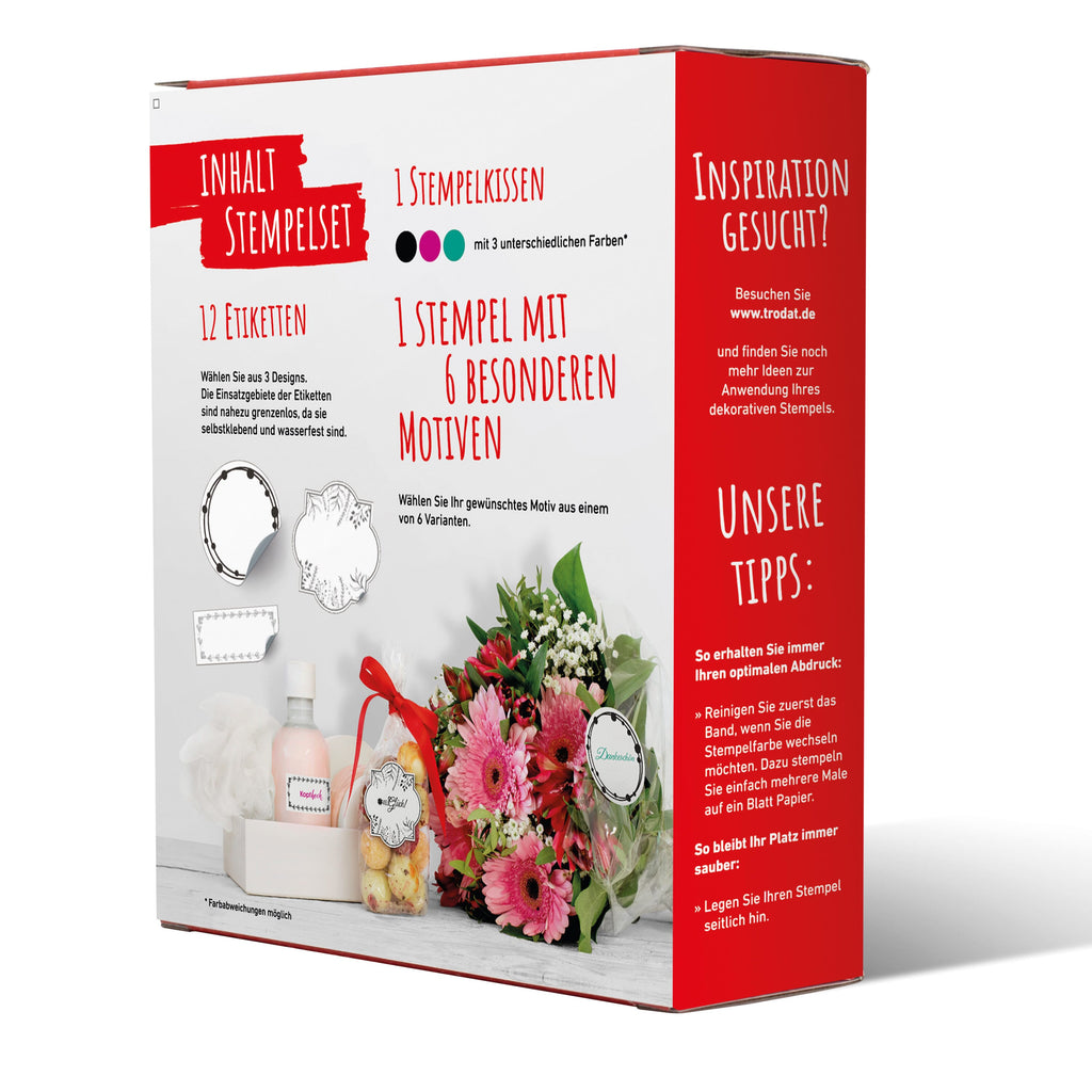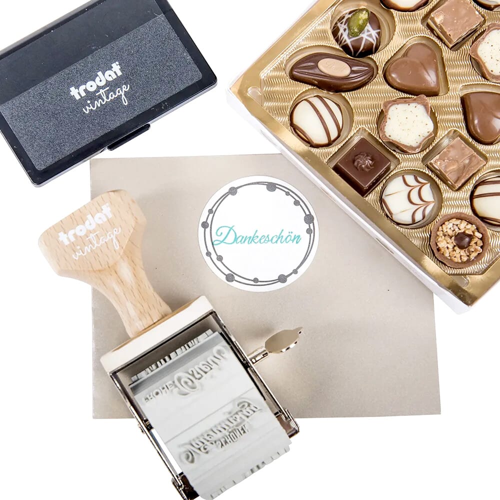 Timbre vintage Trodat avec 6 motifs spéciaux sur le thème 1 tampon encreur manuel avec 3 couleurs (noir, vert et pourpre) et 12 étiquettes selon l'occasion.