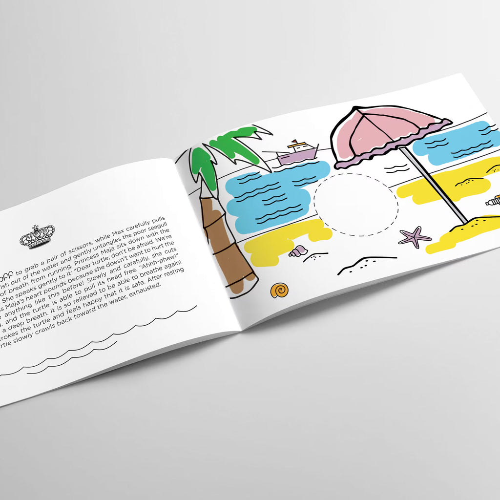 - Ein 16-seitiges Büchlein erzählt die Abenteuer von Maja & Max am Strand zum Vorlesen, Stempeln und Ausmalen