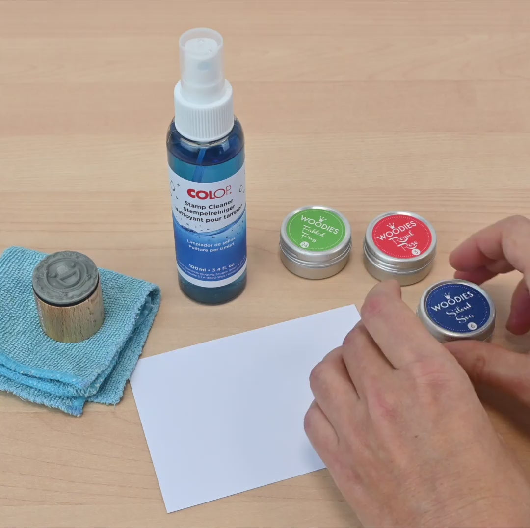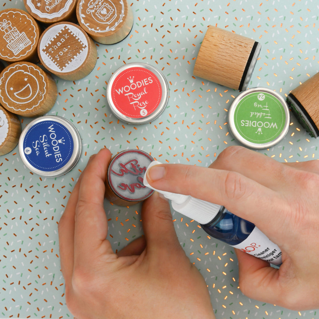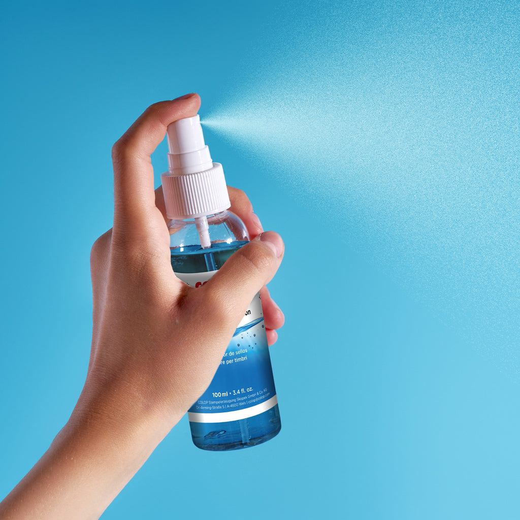 1️⃣ Stempel reinigen: Lege den Stempel auf ein Papiertuch und sprühe den Reiniger direkt auf die Textplatte.