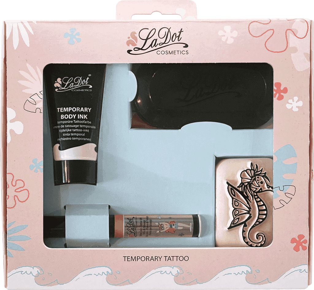 - Komplett-Set - Mit dem LaDot Tattoo Set 8 erhalten Sie alles, was Sie für ein temporäres Tattoo benötigen. Das Set beinhaltet einen mittelgroßen Tattoo-Stempel, eine 15 ml Tube schwarze, hypoallergene und wasserfeste Farbe, ein mittelgroßes Stempelkissen (7,5 x 3,5 cm) und ein pinker Liner.
